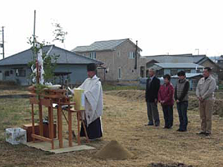 地縄張りを行い,建物位置や敷地間隔をイメージしていただきます。 着工前にはご希望により地鎮祭を行います。
